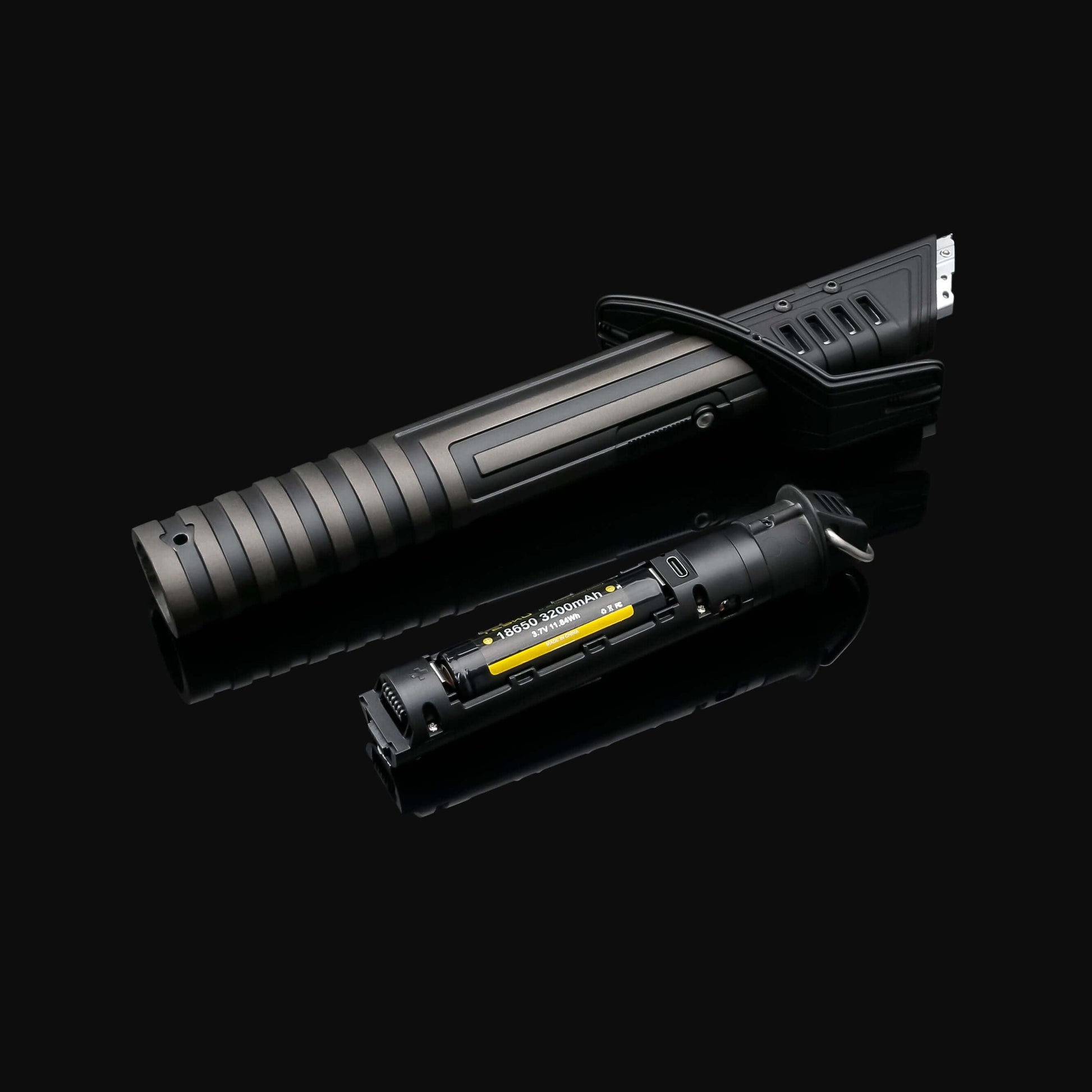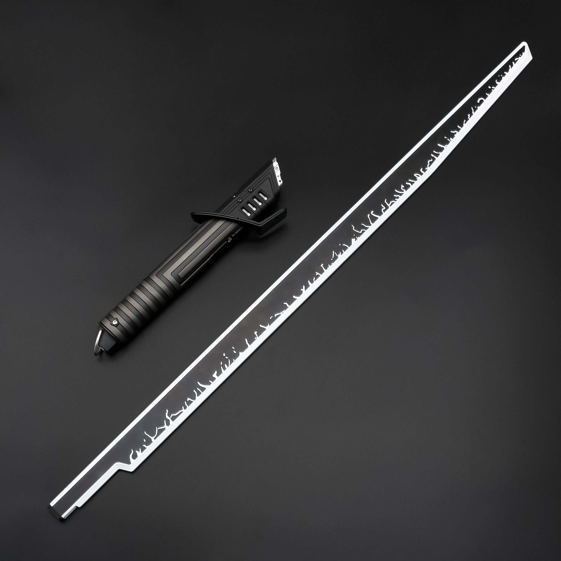 Unlike any other saber, the Mando features a flat, black blade.